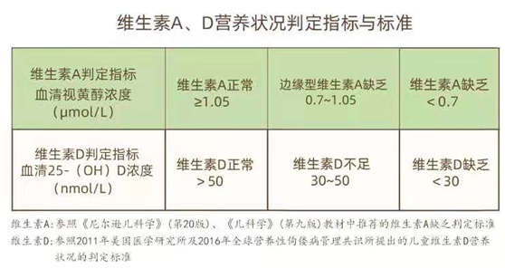 我們必須正視一個事實(shí):我國兒童維生素 A、D 整體營養(yǎng)水平未達(dá)標(biāo)??吹竭@媽媽可能不免疑惑:怎么才能判定寶寶是否達(dá)標(biāo)呢?對此,補(bǔ)充指導(dǎo)也給出了明確標(biāo)準(zhǔn):
