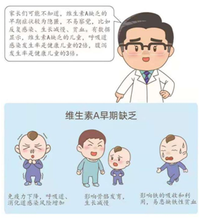 但就像補(bǔ)充指導(dǎo)漫畫里一樣,很多媽媽被看不見的“隱性饑餓”蒙蔽,覺得自家寶寶飲食沒有問題,看著也挺健康,營養(yǎng)狀況應(yīng)當(dāng)是“鐵桶一塊”,卻忽視了微量營養(yǎng)素這一短板,其中就包括了維生素A和D。缺乏維生素AD給寶寶身體帶來的不良影響是循序漸進(jìn)的,早期癥狀并不明顯,所以不易被察覺,危害絕不可小覷,如下圖所示: