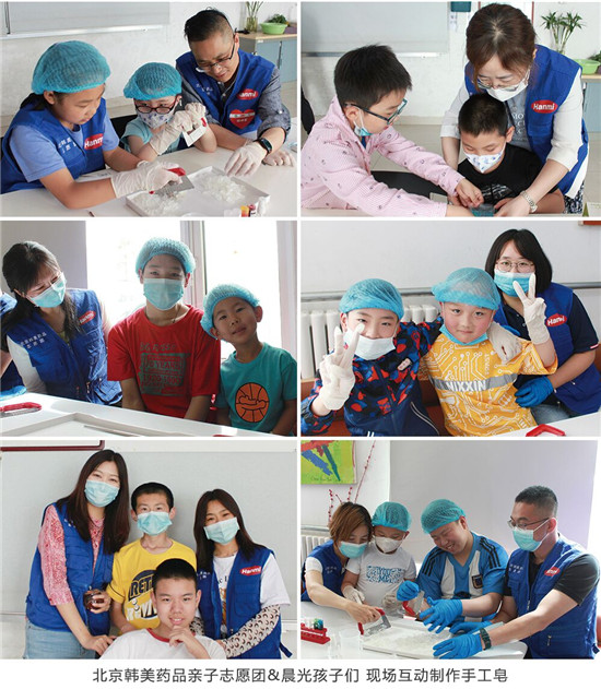 2021年5月23日,在愛心公益活動現(xiàn)場,北京韓美藥品的親子志愿家庭分組與孩子們進行著愉快的交流互動:他們在一起講故事、制作手工皂、嬉戲玩?!虝旱臅r光,有著太多的美好值得記憶。晨光腦癱兒童康復中心孩子們的感激話語,一句句暖進了愛心志愿者的心里;孩子們做手工皂、講故事時,露出的天真笑臉,讓夏日的風變成溫柔的手,令周末的奔波,變得更有意義。