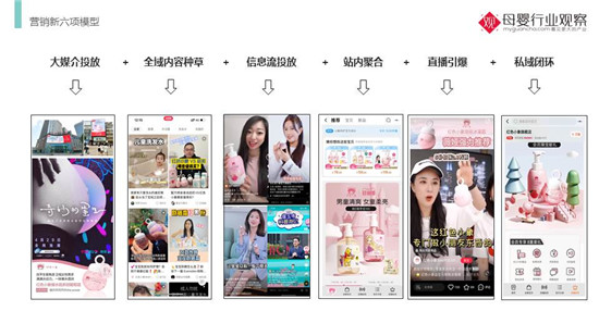 在營(yíng)銷上,這是我總結(jié)的新六項(xiàng)營(yíng)銷模型——大媒介投放+全域內(nèi)容種草+信息流投放+站內(nèi)聚合+直播引爆+私域閉環(huán)。我們發(fā)現(xiàn),兒科醫(yī)生、育嬰專家對(duì)在母嬰人群的影響最大,分別占比達(dá)到了63.7%和56.5%。所以在全域內(nèi)容種草板塊,紅色小象持續(xù)以專家背書(shū)為核心,通過(guò)達(dá)人測(cè)評(píng)+明星寶爸寶媽種草+全域曝光的組合拳方式,去打透各類母嬰人群,持續(xù)建設(shè)品牌口碑。