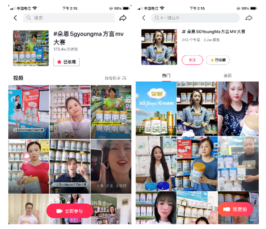 截止發(fā)稿日,記者獲悉,在抖音和快手短視頻平臺(tái),“朵恩5GYoungMa方言MV大賽”話題已近200萬次播放。當(dāng)中的作品異彩紛呈,參與的用戶有“不喝奶不走星人”“奶爸胡渣男”“奶粉罐當(dāng)架子鼓打的小仙女”“空罐當(dāng)做琴弦撩撥的小姐姐”等等腦洞大開的年輕人,充分展現(xiàn)了朵恩滿足個(gè)性、青春、時(shí)尚的消費(fèi)需求,并進(jìn)一步促進(jìn)羊奶粉消費(fèi)多元化轉(zhuǎn)型升級(jí)的實(shí)力。
