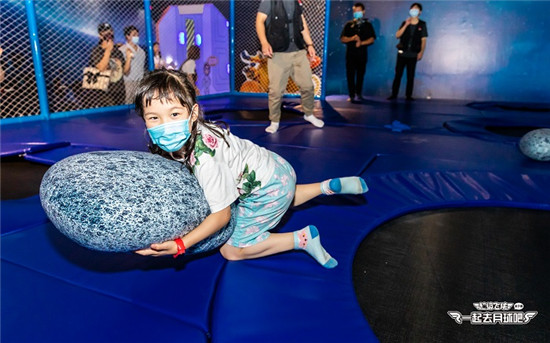 小朋友們需要站在蹦床上,撿起月石扔向小行星,阻止小行星撞向地球。
