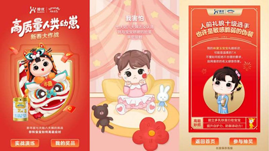 124,“高質量人類幼崽新春大作戰(zhàn)”H5一經推出,再度刷屏微信朋友圈,精確戳中春節(jié)親子家庭痛點,令無數家長紛紛留言太真實了”“代入感太強。澳優(yōu)能立多聚焦春節(jié)走親訪友時,各種親戚對待家中寶寶的不當行為,通過打造更富有趣味性和畫面感的互動H5,指導家長們教導寶寶如何機智化解危機,從而解鎖寶寶的新春高能技能。